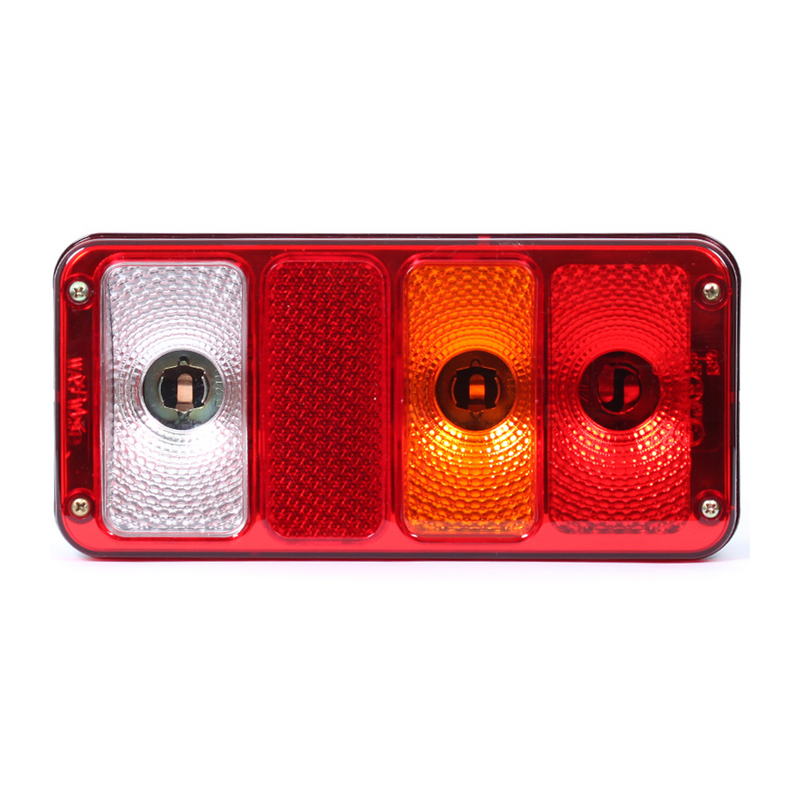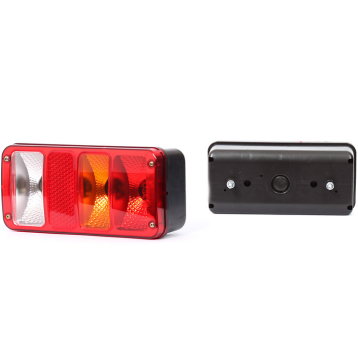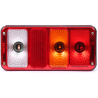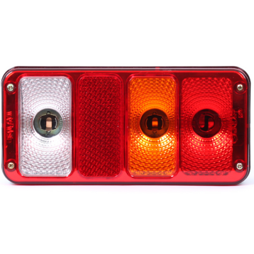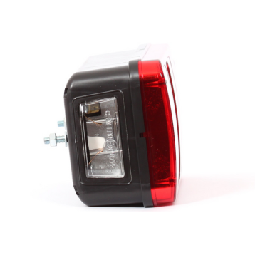 Funkcie: brzdové svetlo, zadné obrysové svetlo, odrazka, svetlo cúvania, smerovka, bočné osvetlenie ŠPZ. Napájanie 12-24V. Svetelný zdroj - žiarovka. Pravá strana.