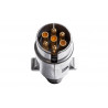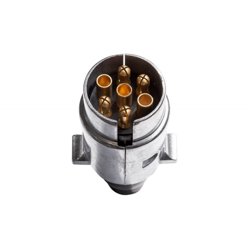 7-kolíková zástrčka prívesu , skrútená. Univerzálna zástrčka, pasuje na akýkoľvek typ prívesu alebo karavanu. Kryt zástrčky je vyrobený z kovu. Má 12 V zástrčku a kovové kolíky, ktoré sú chránené proti hrdzi. Zástrčka je preto ideálna pre každý karavan, ktorý bude často stáť, napríklad na dvore pred domom. Veľmi jednoducho sa inštaluje a zaisťuje neustále prepojenie elektrického systému prívesu s automobilom, čo zaručuje nepretržitú prevádzku všetkých svetiel počas jazdy.